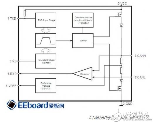 CAN收发器是Atmel公司自家的产品 ATA6660,支持差分串行总线标准