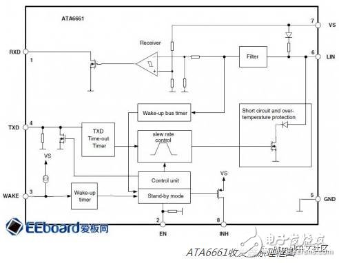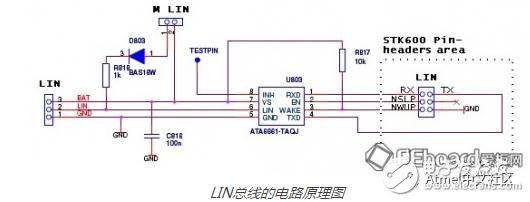 STK600开发套件使用的LIN收发器为Atmel的ATA6661,支持LIN 2.0规范,紧挨着RS232串口,其待遇可见一般,十足是个跟班的命。