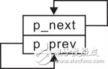 由于此时还没有添加其它任何结点,仅存在一个头结点,因此该头结点既是第一个结点(头结点),又是最后一个结点(尾结点)。按照循环链表的定义,尾结点的p_next指向头结点,头结点的p_prev指向尾结点,仅有一个结点的示意图详见图3.17。