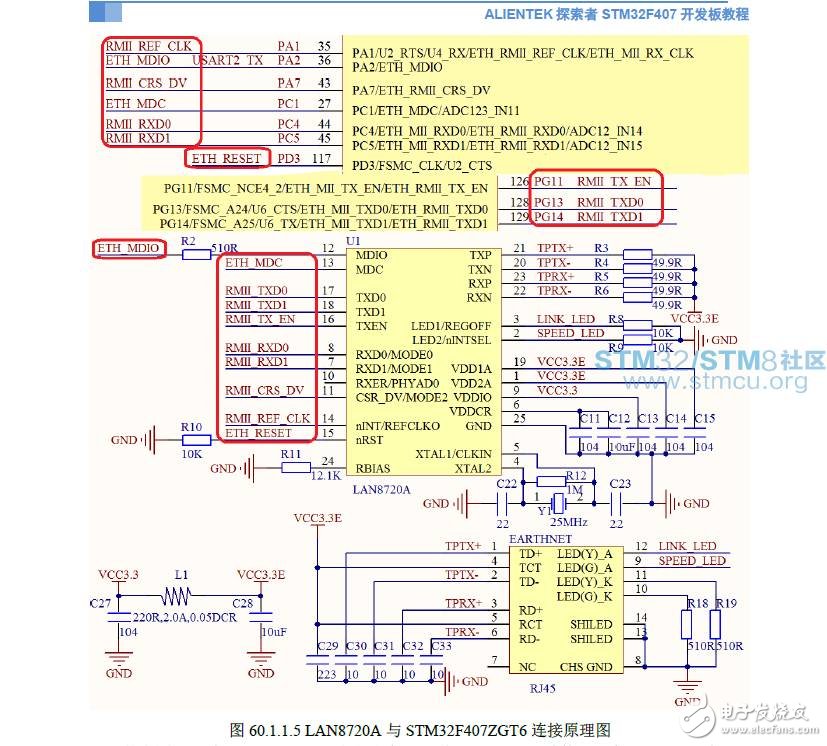原子F407板子上的LAN8720A的RMII接口引脚如下图,
