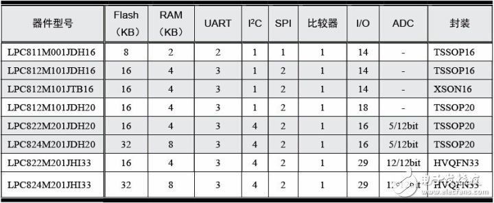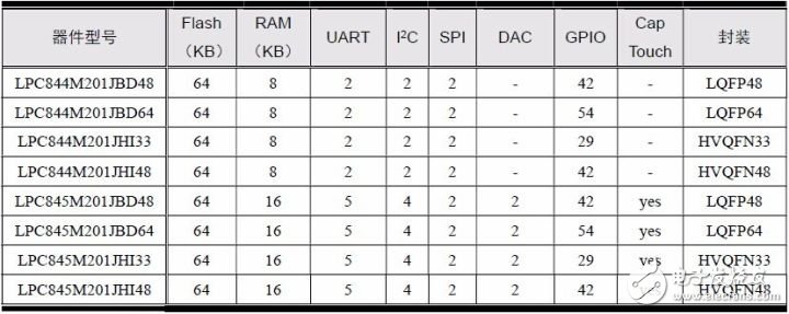 表1.1 LPC800 系列MCU 选型表