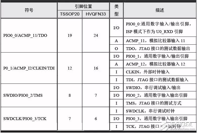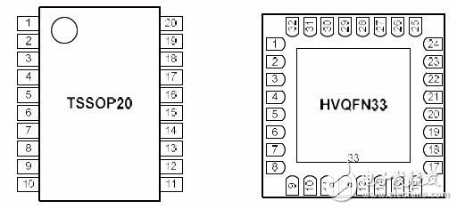 LPC824 系列MCU 有两种封装,分别为TSSOP20 和HVQFN33,其引脚分布详见图1.2。