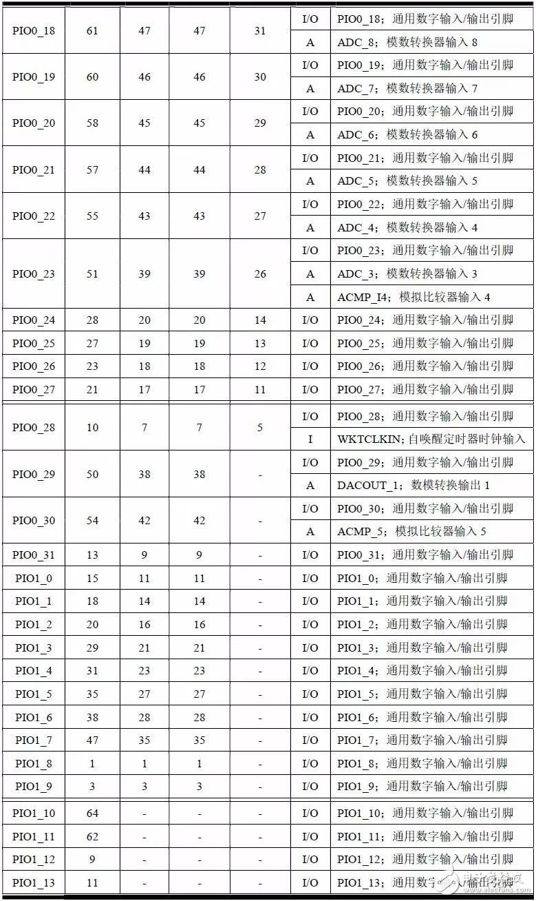 LPC84x 系列MCU 的引脚描述及主要功能详见表1.4。