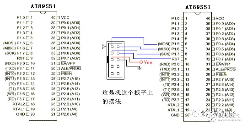看上图的左边AT89S51 引脚图的P1.5、P1.6、P1.7 的第二功能分别为MOSI(主机发送从机接收)、MISO(主机接收从机发送)、SCK(时钟脉冲信号由主机发送)。那什么时候才能启用第二功能呢?就是当复位脚RST 接高电平一直处于复位状态时就可用第二功能了,所以在ISP 下载板上有一条线接至AT89S51 的第9脚(RST)上,就是在写程序前先发一个高电平将S51 的RST 脚设为复位态,然后就可通过MOSI、MISO 向S51 内写程序了。