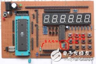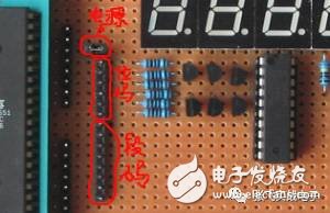 接下来就是确定电路。电路的接口与AT89S51 间有三组接口:段码、位码和电源。为了让AT89S51 独立出来这三级接口都采用插针做接口,用排线自由连接到AT89S51 的P1-P3 口,电源用短路帽连接,完成后的板子见下图: