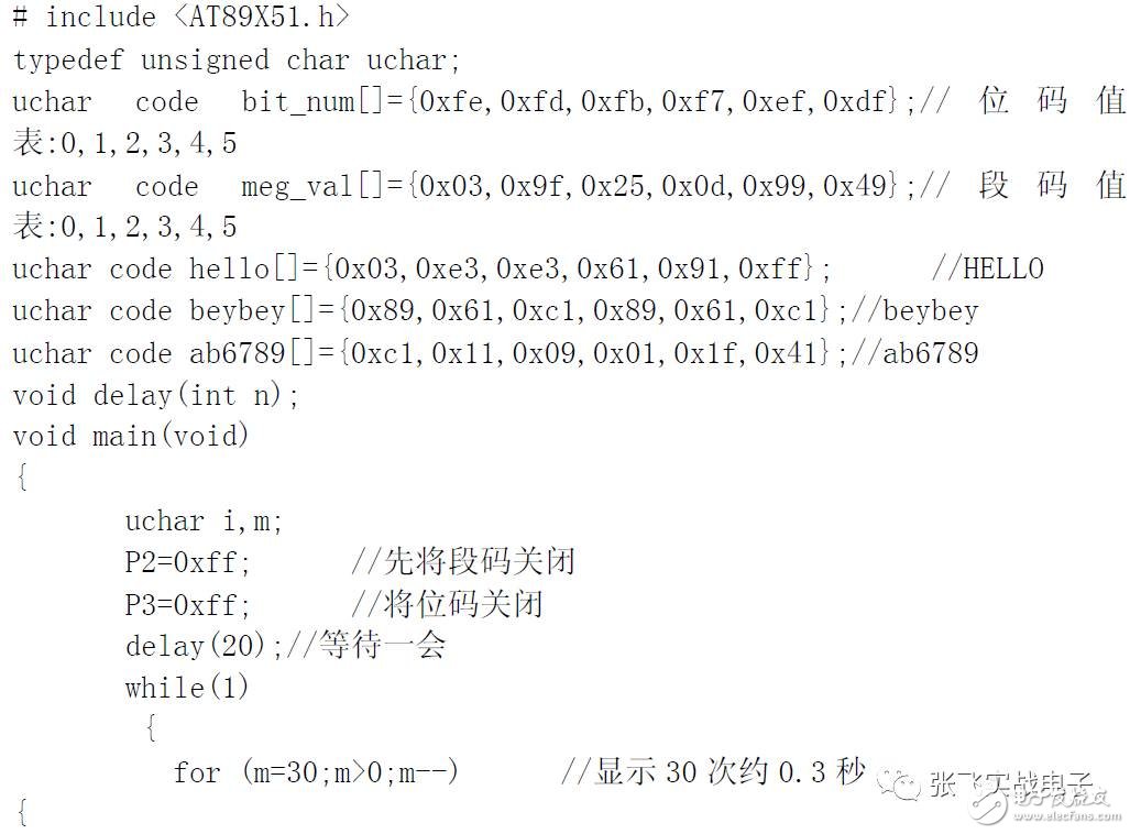 在这里我说一下段码的排列,好多人问数码管段码是如何排列的,我也在网上查了,好像没有什么标准的排法,随自己的接法而定,这也是导致为什么在网上下载的一些数码管程序在自己的板子上不能正常显示的原因。就普遍而言我最上面的那张图示的标法最多,在上面程序里原打算也是P2_0 对应段码a(也就是上面的横)。一直到P2_7 对应段为h(就是小数点)。结果哪知道P2 口刚好是反的。这样一来也就是倒过来了,P2_0 对应段h(小数点了)。例如我原先定义的数码管显示“2”段码为10100100B 的,一接反了就不再是“2”了。而要想再显示“2”那就把段码的高低位倒过来。改为00100101B 就OK 了。