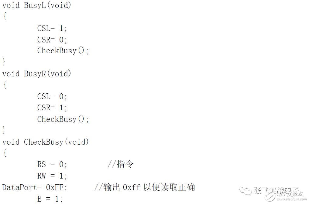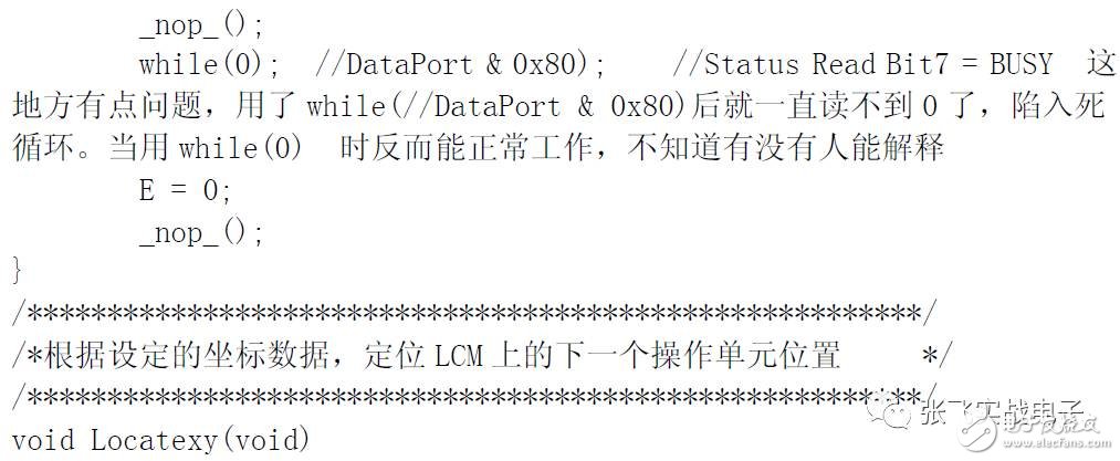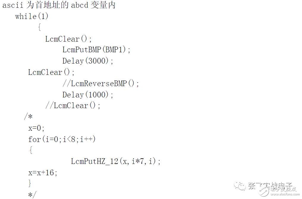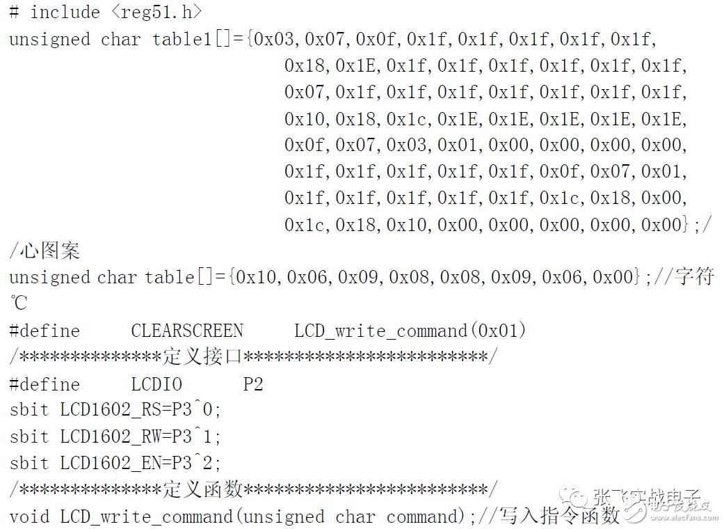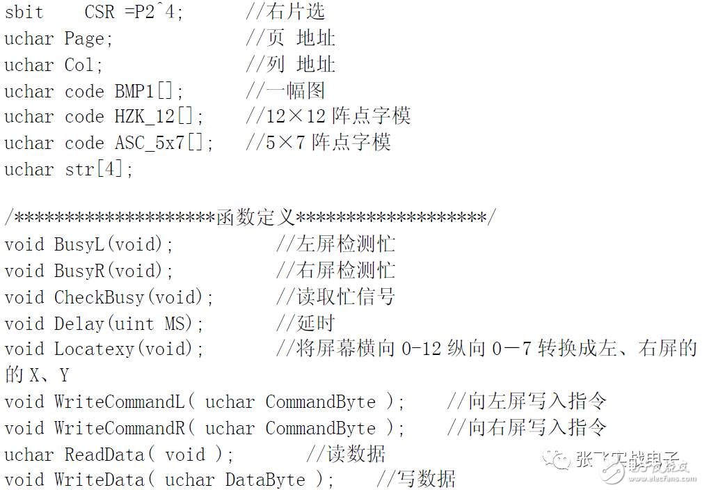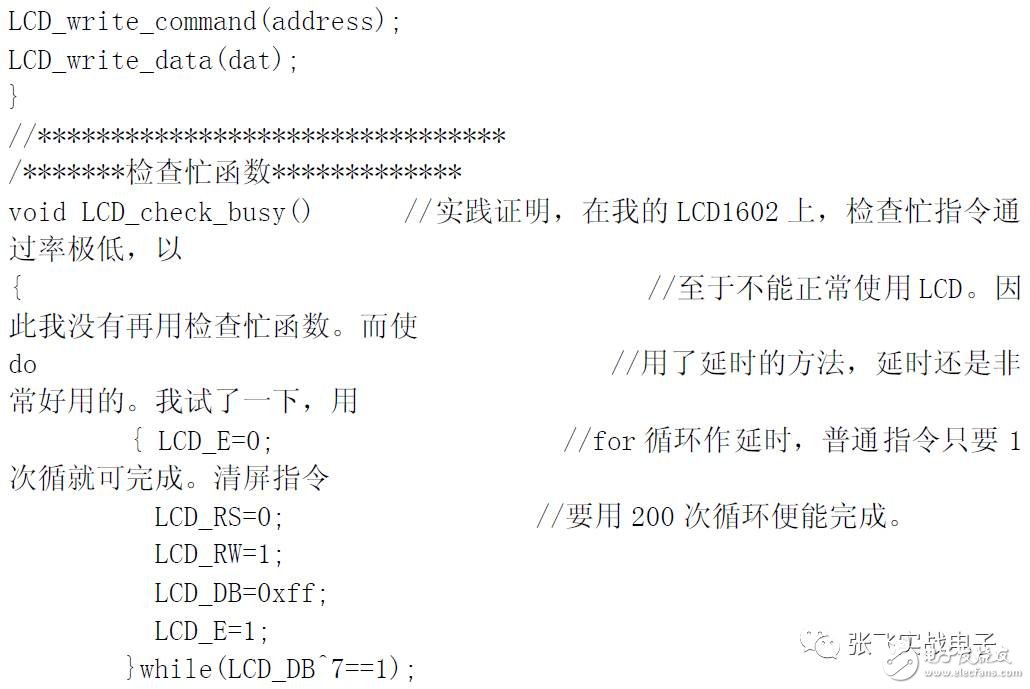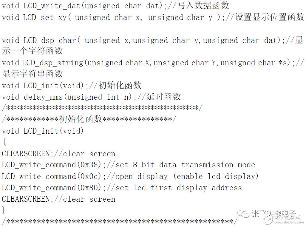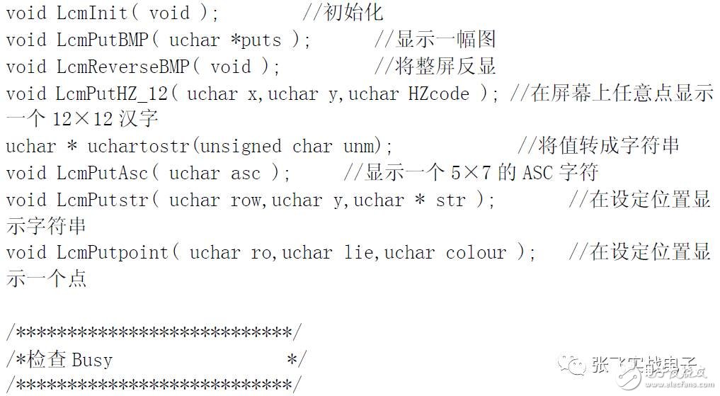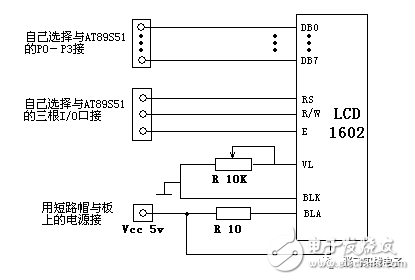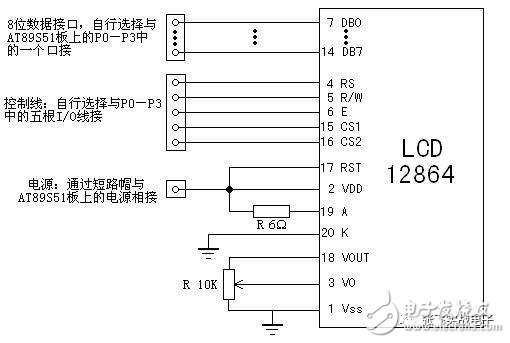 具体电路的制作是很简单的,就接了两个电阻,一个是10 欧姆的背光限流电阻,另一个是2K 的LCD 极板电压调节电阻。这两个电阻的阻值怎么定呢?背光比较简单,它就相当于在后面接了几个发光二极管,任何时候你只要在15、16 脚串上个100 欧的电位器接上电源,调节电位器,觉得亮度合适。此时的阻值便可。LCD 液晶极板驱动电压调节电阻的确定就稍微麻烦一点。在各数据线,控制线接好关通上电源的前提下在第3 脚(VEE)和地之间接一个10K 的电位器。调节电位器。当3 脚电压高时为全亮,电压为0 时为全暗(液晶全显示为黑块)。你用电位器把屏幕从全暗刚好调到变亮。这时便可调试程序。待屏幕能正确显示后再细调电位器,使对比度合适。这时的阻值便可确定,然后换成等值的固定电阻焊上便可。