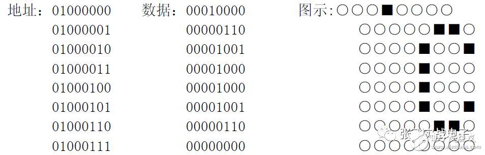从这个指令可以看出指令数据的高2 位已固定是01,只有后面的6 位是地址数据,而这6 位中的高3 位就表示这八个自定义字符,最后的3 位就是字模数据的八个地址了。例如第一个自定义字符的字模地址为01000000-01000111 八个地址。我们向这8 个字节写入字模数据,让它能显示出“℃”