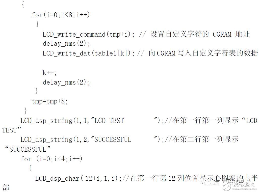 如果我们要想显示这8 个用户自定义的字符,操作方法和显示CGROM 的一样,先设置DDRAM 位置,再向DDRAM 写入字符码,例如“A”就是41H。现在我们要显示CGRAM 的第一个自定义字符,就向DDRAM 写入00000000B(00H),如果要显示第8 个就写入00000111(08H),简单吧!