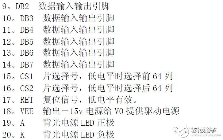 具体的电路还是两个电阻。一个背光限流电阻。一个液晶驱动电压调节电阻。背光电阻还是任何时候在19、20 脚与电源之间串上个100 欧电位器接上电源。调节电位器到合适亮度。具体值最好是到调试完程序能够正常显示后再将阻值确定换成固定电阻。液晶驱动电压的调整在数据线、电源线接好的前提下是在Vee(-15v)和地之间接一个电位器。中间接V0,通过调节电位器来调节V0 上的电压。当V0 上为-15V 时为全暗(液晶显示为全黑)。当V0 为0V 时为全亮。调节电位器使屏幕从全暗刚好变到亮时,便可进行程序的调试。待屏幕显示正常后,进行对比度的细调,然后测量这两边的阻值在地和V0 之间、V0 和Vee 之间换成两个固定电阻焊上就好了。注意在V0 的电压是在一个很小的范围有效。我的就是在-2.2——-2.5 这个范围。仔细调节V0 和地之间的电阻使V0 上的电压在2.3V。