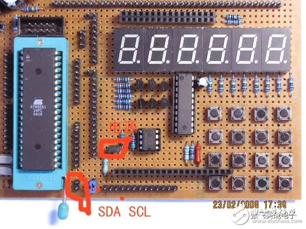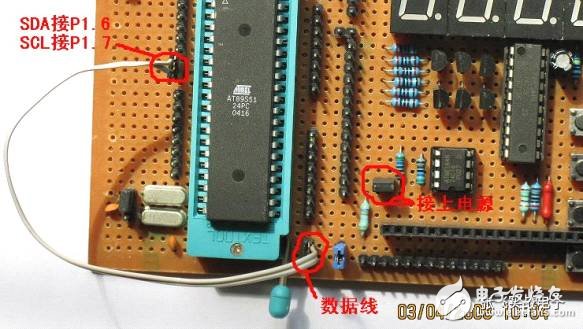 现在我们接上电源短路帽把AT24C16 电源接好。将两个数据线用跳线接到P1.6和P1.7 口上(接到哪个口上可以自己选的)。注意分清哪个是SDA 哪个是SCL。别弄错了。