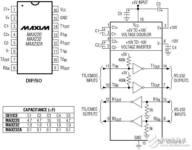 先得搭建个临时电路试一试,MAX232 结构图和电路图如下: