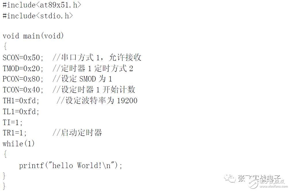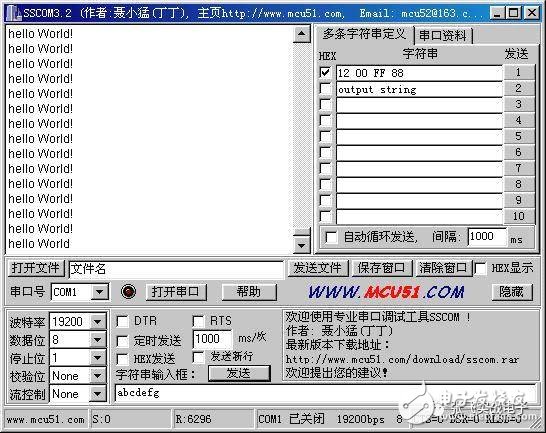 在电脑上将程序写好,编译后用ISP 写入S51。程序很简单,就是不停地向PC传送“hello World!”。程序如下: