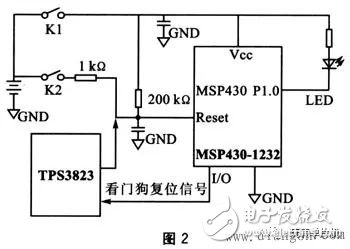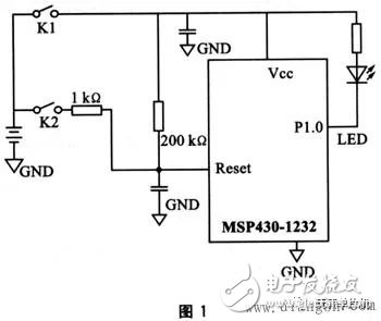 现今市面上流行的一些单片机,多嵌有内部WDT,如TI的MSP430系列,Philips的P87XXX和P89XXX系列,Microchip的PIC列,Atmel的AT89SXX系列和Holtek公司的Htxxx系列。但是这些内部看门狗在工作时,多存在一定的误差。一些工程师在设计的过程中,由于忽略了这一点,导致系统出现异常。MSP430系列单片机是美国德州仪器公司(TI)近几年开发的新一代单片机,该系列是一款16位、具有精简指令集、超低功耗的全新概念混合型单片机。在众多单片机系列中,由于它具有极低的功耗、丰富的片内外设和方便灵活的开发手段,已成为一颗耀眼的新星。其内部自带看门狗及复位电路,理论上如果程序跑飞,可用看门狗将其复位。但在实际使用过程中,发现看门狗的作用并非万无一失,以下实验证明了这一点。实验电路如图1所示。