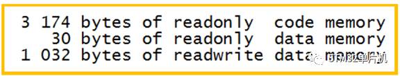 在*.map文件中,会有如上图的内容,其中的readonly code memory加上readonly data memory的和,就是Flash的占用量。而Readwrite data memory的大小即为SRAM的占用量。那么上图所示的Flash占用量即为3204=3174+30,SRAM占用量即为1032。因用户堆(Cstack)我们设置的为1024,所以真正应用代码所占用的SRAM量为8=1032-1024.
