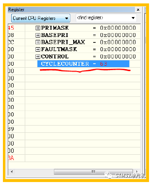 代码的运行效率部分,我们是通过IAR提供的内核运行周期数(CYCLECONTER)来计算的。在功能函数的开始处和结束处分别设置断点,两次内核运行周期数的差值,就是此处代码的运行周期。