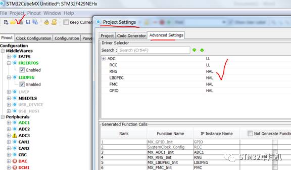 在CubeMx界面下,做好各个外设的选择及配置后,在ProjectProject SettingAdvanced Settiing如下图示界面上,你可以选择要使用的库类型:HAL/LL.