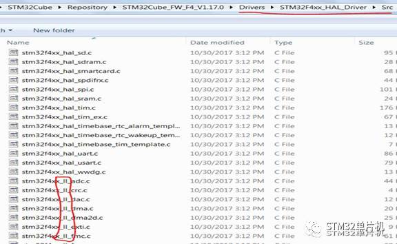 另外,偶尔人询问及LL库在哪里,其实LL库函数跟HAL库函数是在同一目录下。以STM32F4为例,你下载STM32CubeF4解压后,在类似如下目录可以看见HAL函数和LL函数库文件。