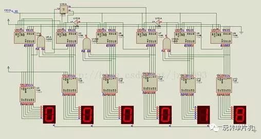 利用一些常用的传统数字电路器件(一般都是集成电路芯片),我们可以设计出如下图的电路。它是一个电子表,有六个数码管显示时间,图中正显示的就是00:00:18。可以看出来这个电路还是挺复杂的,设计起来也是很费时间的。