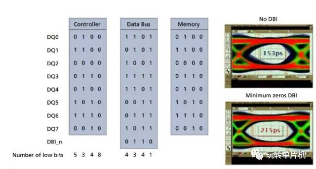 如上面描述,根据POD的特性,当数据为高电平时,没有电流流动,所以降低DDR4功耗的一个方法就是让高电平尽可能多,这就是DBI技术的核心。举例来说,如果在一组8-bit的信号中,有至少5-bit是低电平的话,那么对所有的信号进行反转,就有至少5-bit信号是高电平了。DBI信号变为低表示所有信号已经翻转过(DBI信号为高表示原数据没有翻转)。这种情况下,一组9根信号(8个DQ信号和1个DBI信号)中,至少有五个状态为高,从而有效降低功耗。