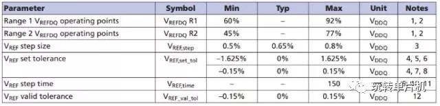DRAM内部VREFDQ通过寄存器(MR6)来调节,主要参数有Voltage range, step size, VREF step time, VREF full step time ,如下表所示。