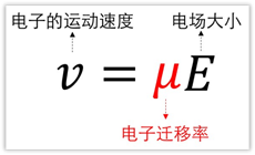 电流的导通依靠的是材料内部载流子的定向移动。当存在着外加电压时,材料内部的自由电子受到外加电压中电场力的作用,会沿着电场的反方向做定向运动产生电流,我们称其为漂移运动。而将这种定向运动的速度称为漂移速度。根据推导可知,当电场增大时电子的运动速度也会随之增大,两者呈线性关系,而这个比例系数就被称作迁移率。