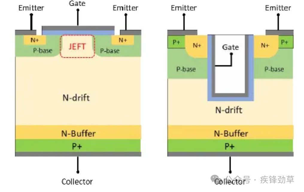 绝缘栅双极型晶体管,是由双极型三极管(BJT)和绝缘栅型场效应管(MOS)组成的复合全控型电压驱动式功率半导体器件。下图显示了一种N沟道增强型绝缘栅双极晶体管结构。IGBT是一个三端器件,正面有两个电极,分别为发射极(Emitter)和栅极(Gate)背面为集电极(Collector)。IGBT的开关作用是通过加正向栅极电压形成沟道,给PNP晶体管提供基极电流,使IGBT导通;反之,加反向门极电压消除沟道,流过反向基极电流,使IGBT关断。