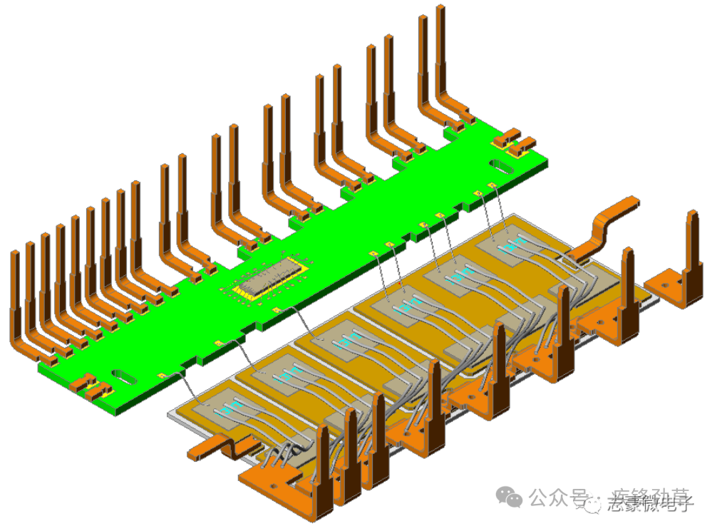 铜直接粘合,其制造方法是:在陶瓷基板两面压合铜箔,其中一面形成特定形状,并在该面装配具有特定走线形状的铜框架,再在铜框架上贴装控制IC、功率元件,然后一体模制成型。