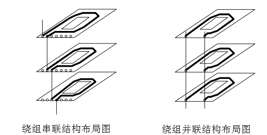 在PCB各层之间有供绕组互联的“通孔”,绕组间的匝数通过“通孔”以串联或并联的方式连接。