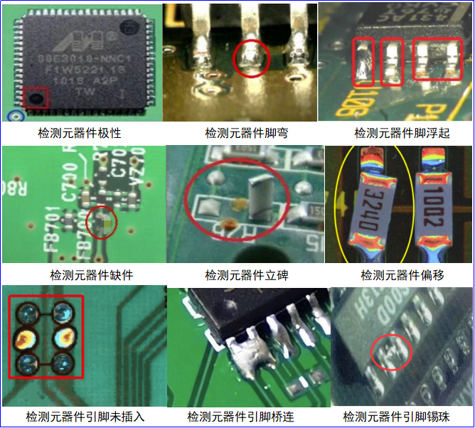 AOI检测的主要内容,包括元器件的多件、缺件、错件、立碑、侧立、偏立、反贴、换件、极反、IC引脚弯曲、文字识别等,以及焊锡的多锡、少锡、无锡、虚焊、短路、锡球、浮起等问题。AOI还可以通过高速精度视觉处理技术,实现对各种不同间距和密度板的检测。