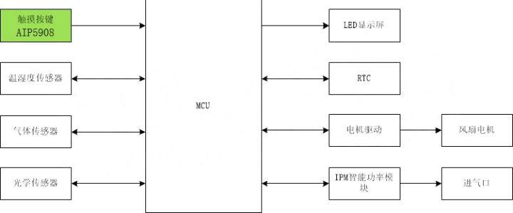 国芯思辰接触的一空气净化器设计方案,按键面板上需要使用8个触摸按键,这里提到国产中微爱芯的8键电容式触摸按键芯片AIP5908,一颗芯片就能实现8键的按键功能。下图为设计框图: