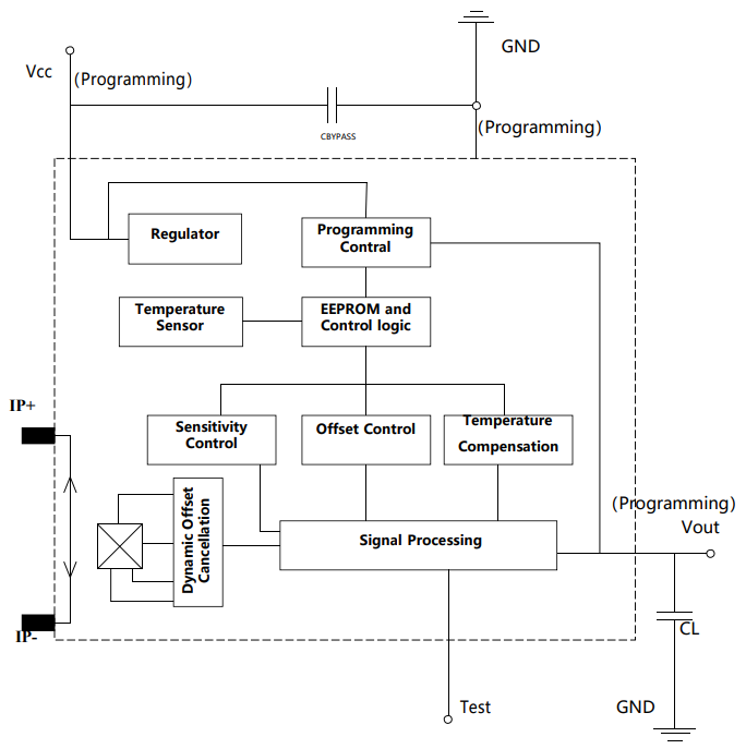 线性霍尔电路采用先进的BCDMOS制程生产,其中包含了高灵敏度霍尔传感器、霍尔信号预放大器、高精度霍尔温度补偿单元、振荡器、动态失调消除电路和放大器输出模块。
