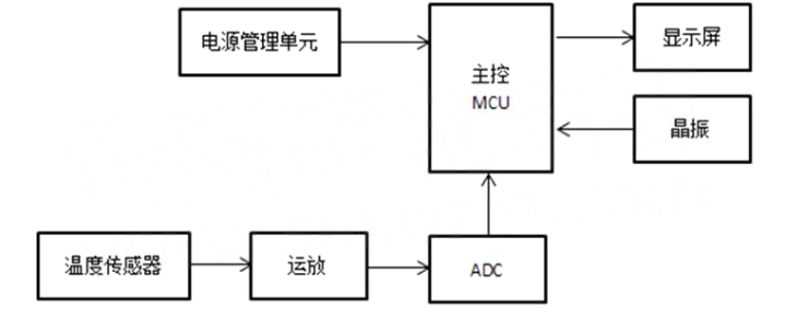 前段时间国芯思辰对接了一个实验室温度采集器项目,该项目是通过多路热电偶采集温度,通过运算放大器将信号放大,再由ADC采集处理后送到MCU,经过MCU处理后由显示屏显示当前温度,项目原理框图如下:
