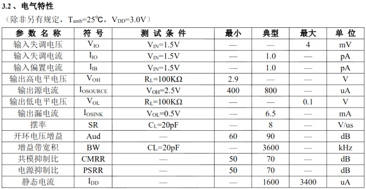 针对环境数据采集器板卡信号调理应用,这里提到中微爱芯的AIP1330,该芯片是一款高摆率、低工作电压、低输入失调电压、低功耗的CMOS双通道运放。支持最低工作电压1.8V,运放可达到满幅输出;工作温度-40~+85℃;每通800uA低工作静态电流;具有3.6MHz的增益带宽乘积、输入失调电压4mV;MSOP8/TSSOP14封装,以下是AIP1330运放的典型电气性能参数: