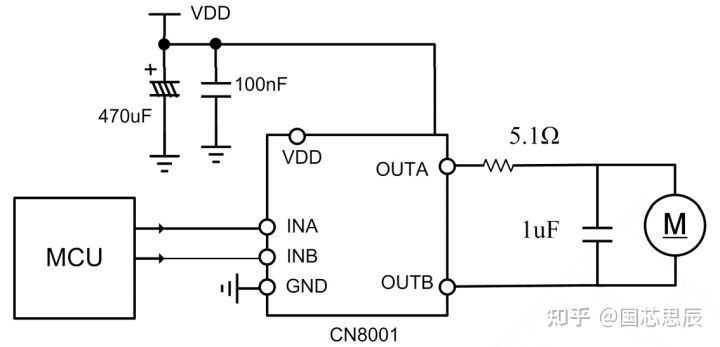 芯北科技的H桥电机驱动芯片CN8001非常适合驱动智能窗帘的直流有刷电机的应用,其典型应用框图如下: