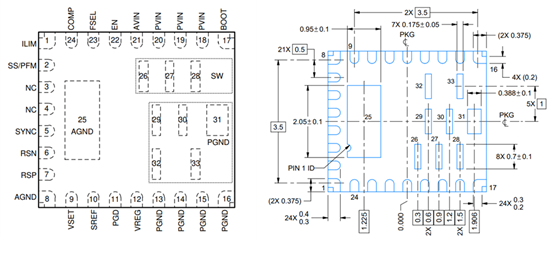 Figure 1:TPS542A52 芯片顶视图(左)和芯片的引脚尺寸图(右)