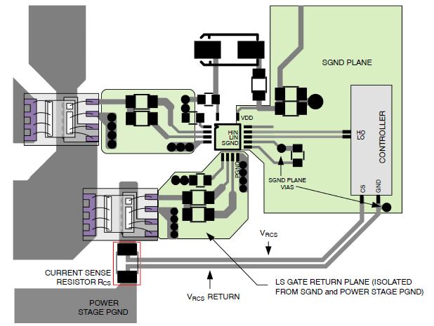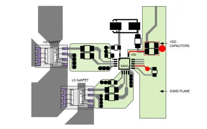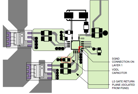 VDDL 电容应尽可能靠近 VDDL 引脚放置。如图2所示,VDDL 电容返回引脚应通过过孔连接到 LS 栅极返回平面。VDDL 电容返回引脚必须连接到驱动器上的 PGND 引脚。VDDL 电容返回引脚通过过孔连接到 LS 栅极返回平面,该平面也通过过孔连接到驱动器 PGND 引脚。