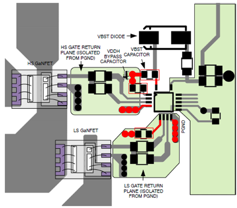 VDDH 电容应尽可能靠近 VDDH 引脚放置。如图2所示,VDDH 电容返回引脚应通过过孔连接到 HS 栅极返回平面(与 VBST 电容共用一个双过孔连接)。