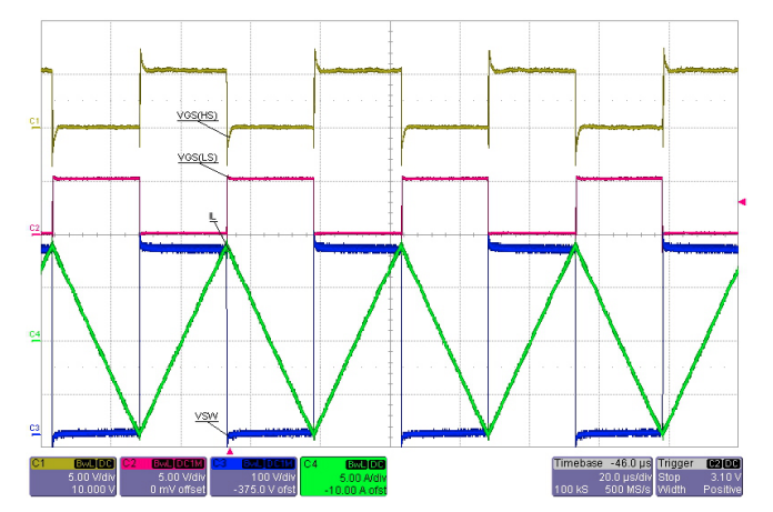 图10所示波形是驱动两个 HEMT、GIT、600 V、26 A、56 mΩ GaNFET 的结果,其电流能力比图9中使用的器件要高。要实现高 dV/dt,需要相当大的漏极电流 ID。例如,所示测量是在 ID = 20 APK 下进行的,导致实测 VDS dV/dt = 75 V/ns。三角形峰值电感电流显示为纯直流,这是进行此测量所需的时基 (2 ns/div) 造成的。VSW 波形的 100 V 欠冲是用于显示高 dV/dt 的测量技术的结果,在开关节点上并不真正存在。