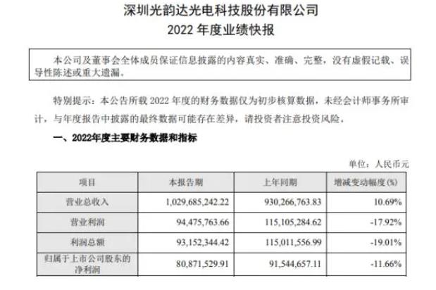 光韵达日前发布了2022年度业绩快报,根据光韵达财报数据显示2022年营业收入约10.3亿元,同比增加10.69%;归属于上市公司股东的净利润约8087万元,同比减少11.66%;基本每股收益0.1618元,同比减少12.4%。