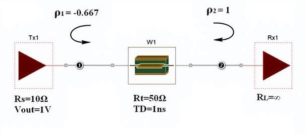 创建了一个简易的信号传输链路模型如下图。信号源驱动内阻Rs为10Ω,输出信号幅度为1V。中间传输线阻抗Rt为50Ω,传输延时TD为1ns。接收端负载阻抗无穷大,相当于远端开路。