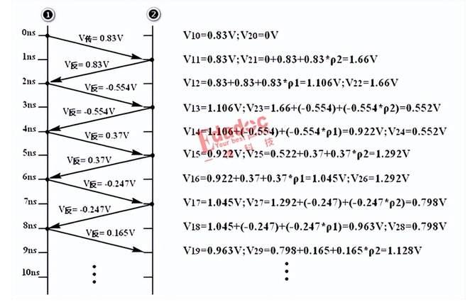 2.经过1ns的传输后,信号到达节点2并发生反射,反射电压为0.83V*1=0.83V。此刻节点2位置的电压V21=0V+0.83V+0.83V*1=1.66V。