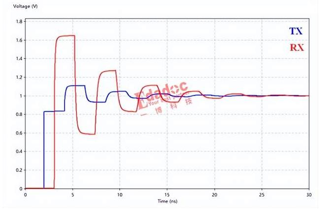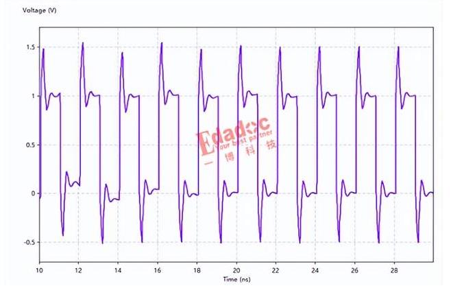 以上展示了信号单边沿后的反射全过程。当连续的码元输出后,将会在每一个上升沿和下降沿后的电平保持期间出现振铃现象。高电平最高位置将达到1.66V,低电平最低位置将达到-0.66V。过冲将会导致接收端误触发造成误码,还可能突破电平接收容限,严重的可能损害芯片。