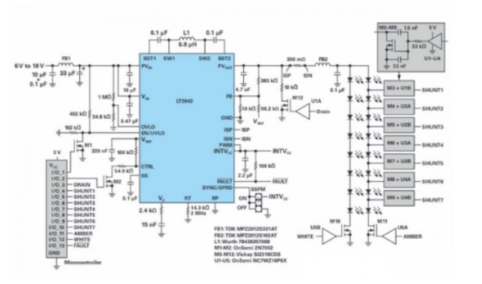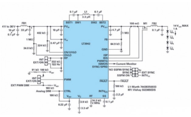 该解决方案还具有高带宽工作性能,可以快速调节输出电流。当在降压模式下工作时,LT3942使用外部PWM源对LED进行100 Hz无闪烁调光,从而实现高达5000:1的调光比。