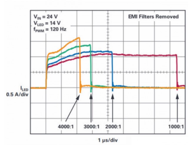 图3.LT3942的高带宽工作性能有助于LED照明应用在宽动态亮度范围内实现高比率PWM调光。无需EMI滤波器,DC2404A在120 Hz时可实现高达4000:1的调光,而在100 Hz时则可实现高达5000:1的调光。