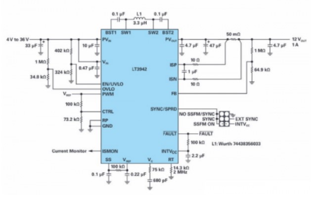 对于需要低噪声电源以满足严格EMI要求的设计,LT3942的SSFM功能有助于降低传导发射和电磁辐射骚扰,其便捷的IC封装引脚排列可实现紧凑的开关热环路。这些特性以及宽输入范围,可在设计人员面临紧凑型电源需求时,简化他们的工作。