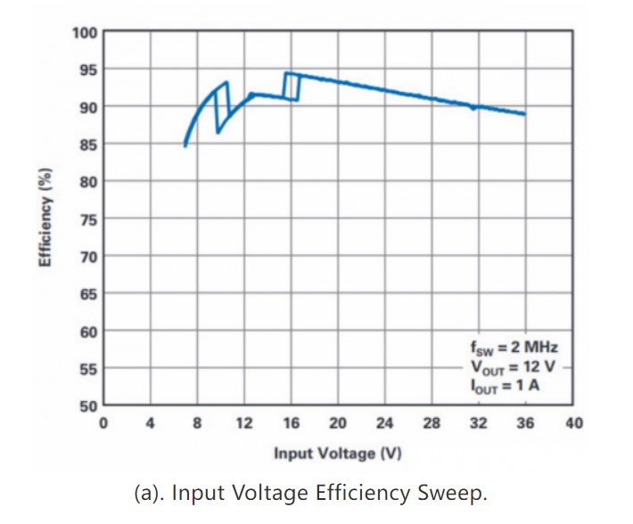 图4中的效率曲线表明,即使工作开关频率为2 MHz时,LT3942 12 V稳压器也具有接近95%的出色峰值效率,而在其大多数输入电压范围内的效率为85%或更高。即使以其总输出功率的十分之一为其输出供电,也可保持80%以上的效率,这表明该器件在轻负载条件下仍可高效运行。