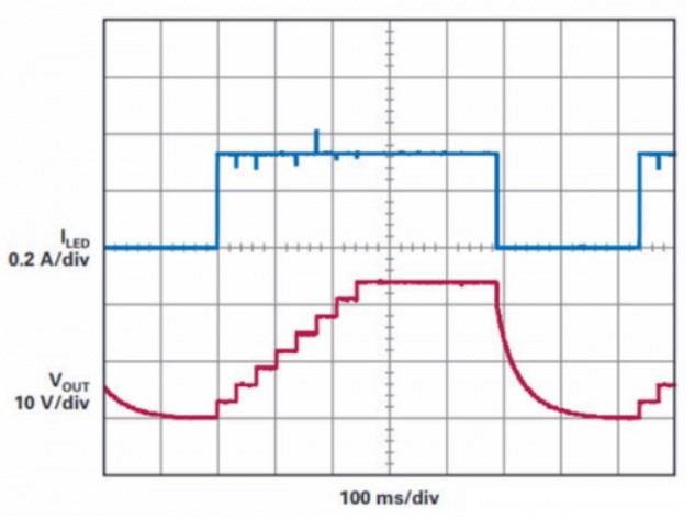 图5.在顺序点亮转向信号应用中,每次点亮一个LED,从而迫使DC-DC转换器迅速适应新的PVIN:PVOUT组合。这对LT3942来说不是问题,因为它可在顺序点亮转向模式期间从升压、降压-升压、降压工作模式无缝转换,从而确保在各种模式下维持稳定的LED电流。