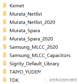 除了选择电容模型,还有另外一件困扰工程师的事情,就是在拿到模型后,如何很好地在仿真软件中应用和管理,下面以Sigrity PowerSI为例,说明针对上述电容模型,如何实现创建、导入、应用、管理等操作。Sigrity的其它PI软件和模型抽取软件如OptimizePI、Clarity 3D Solver,使用方法上基本一致。这里要特别提一点,在安装完成Sigrity软件后,提供了如下图所示的多家电容厂商电容模型库,里面有SPICE模型也有S参数模型,默认路径在《Sigrityxxxx_install》\share\library\decap_library。
