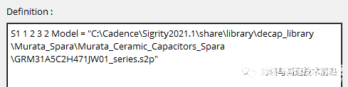 b. S参数模型(.s2p):在Definition界面按照语法规则输入电容S参数模型的调用指令